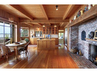 The interior was all warm wood floors, knotty pine paneling, and wood beamed ceilings. A stone fireplace graced an inviting great room which ran along a good portion of the back of the house. A comfortable window seat was built into a sitting area which also housed a wood stove, giving an almost rustic feel to the space.